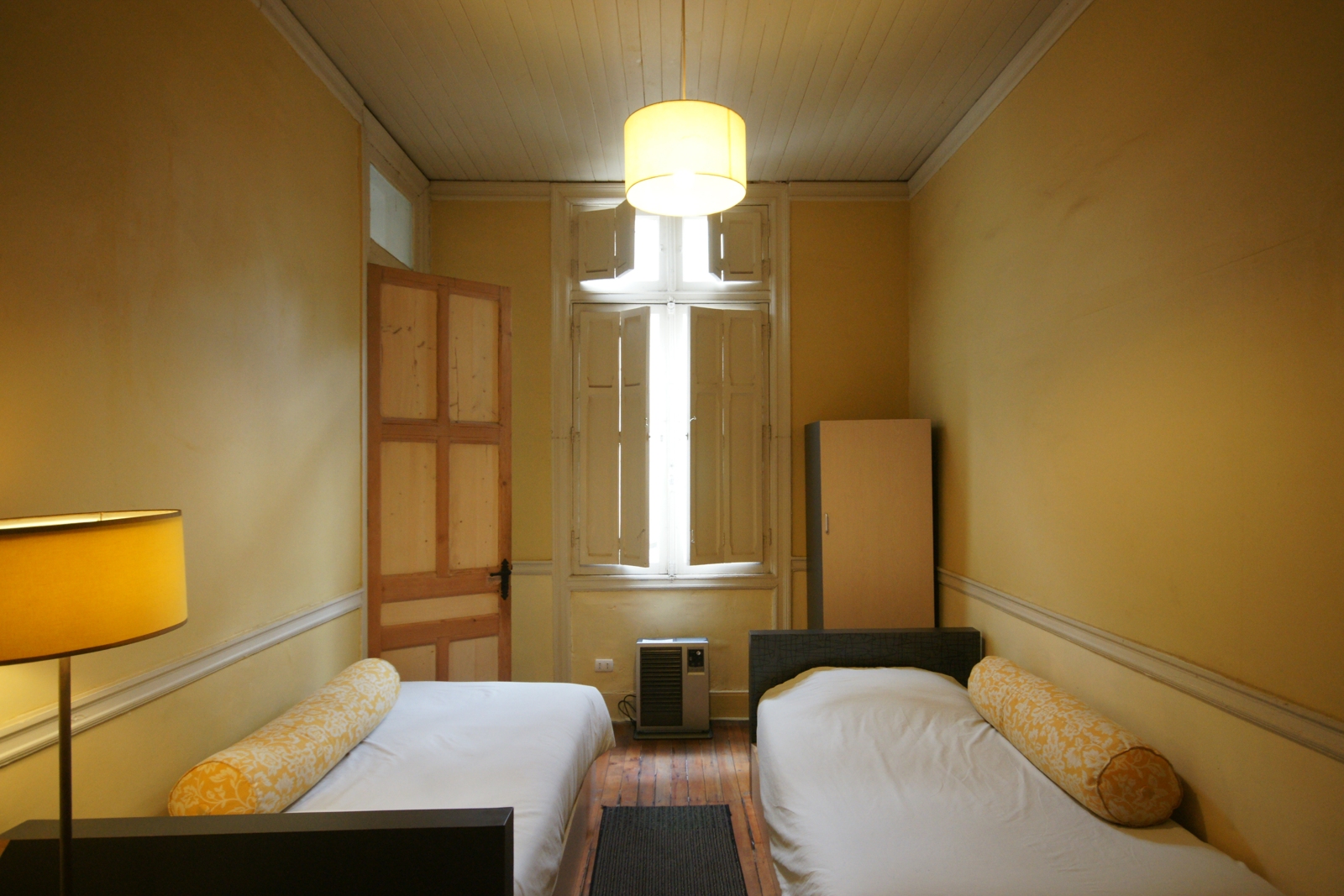 Habitación doble con 2 camas individuales, techos altos y baño compartido.